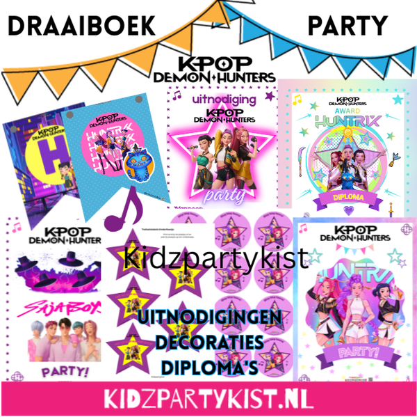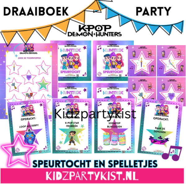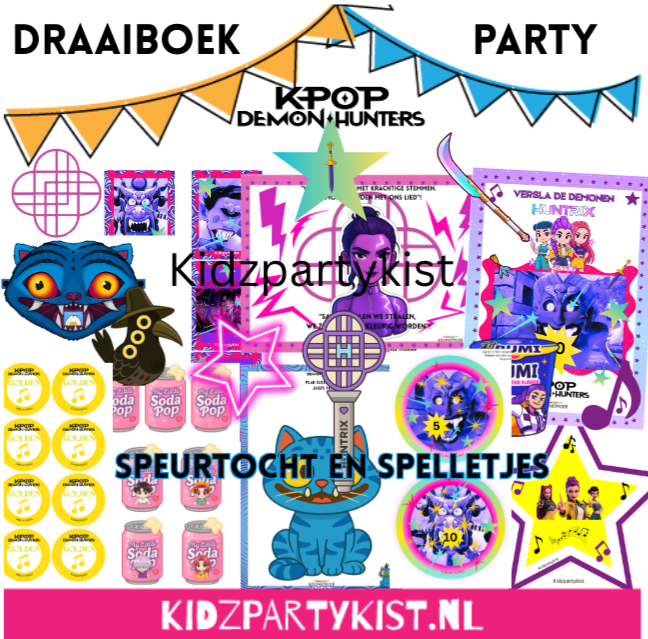 • Draaiboek met: uitgebreide verhaallijn K-Pop Demon Hunters, uitleg spelletjes en uitgebreide informatie die je nodig hebt voor het K-Pop Demon Hunters kinderfeestje.